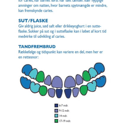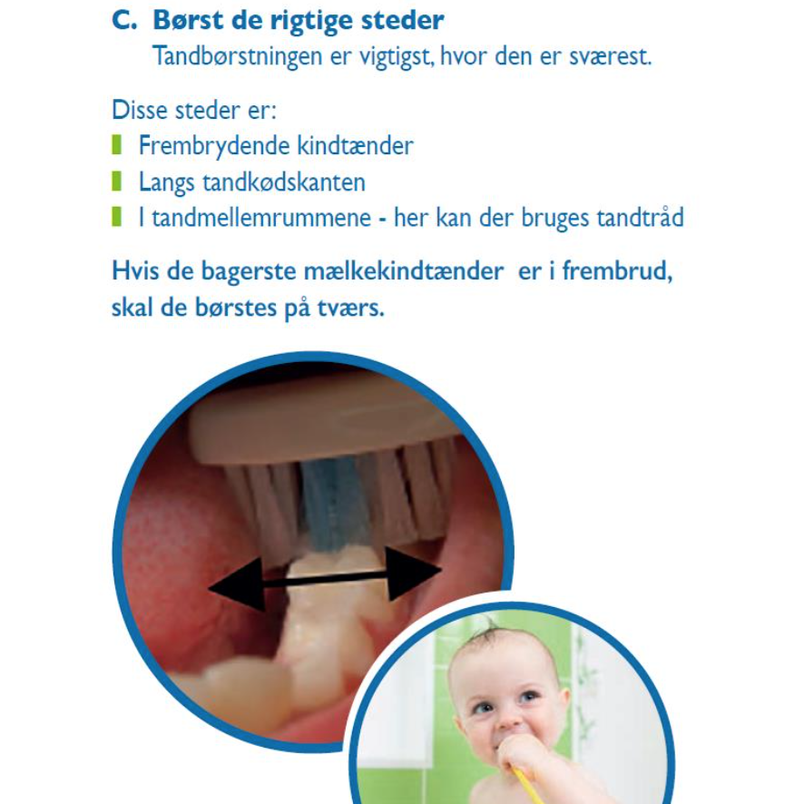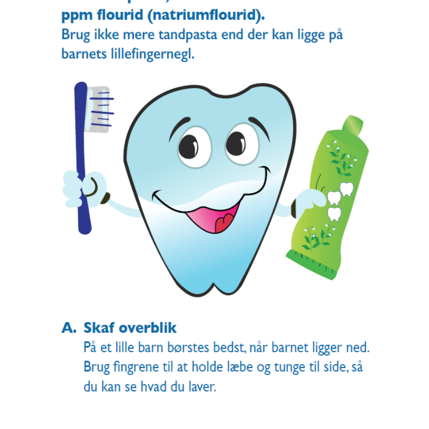 Det er vigtigt, at dit barn får børstet tænder af en voksen fra den første tand bryder frem. Der går nemlig ikke hul i en ren tand. Brug tandpasta med fluorindhold på 1450 ppm. Dog kun en mængde svarende til barnets lillefingernegl.